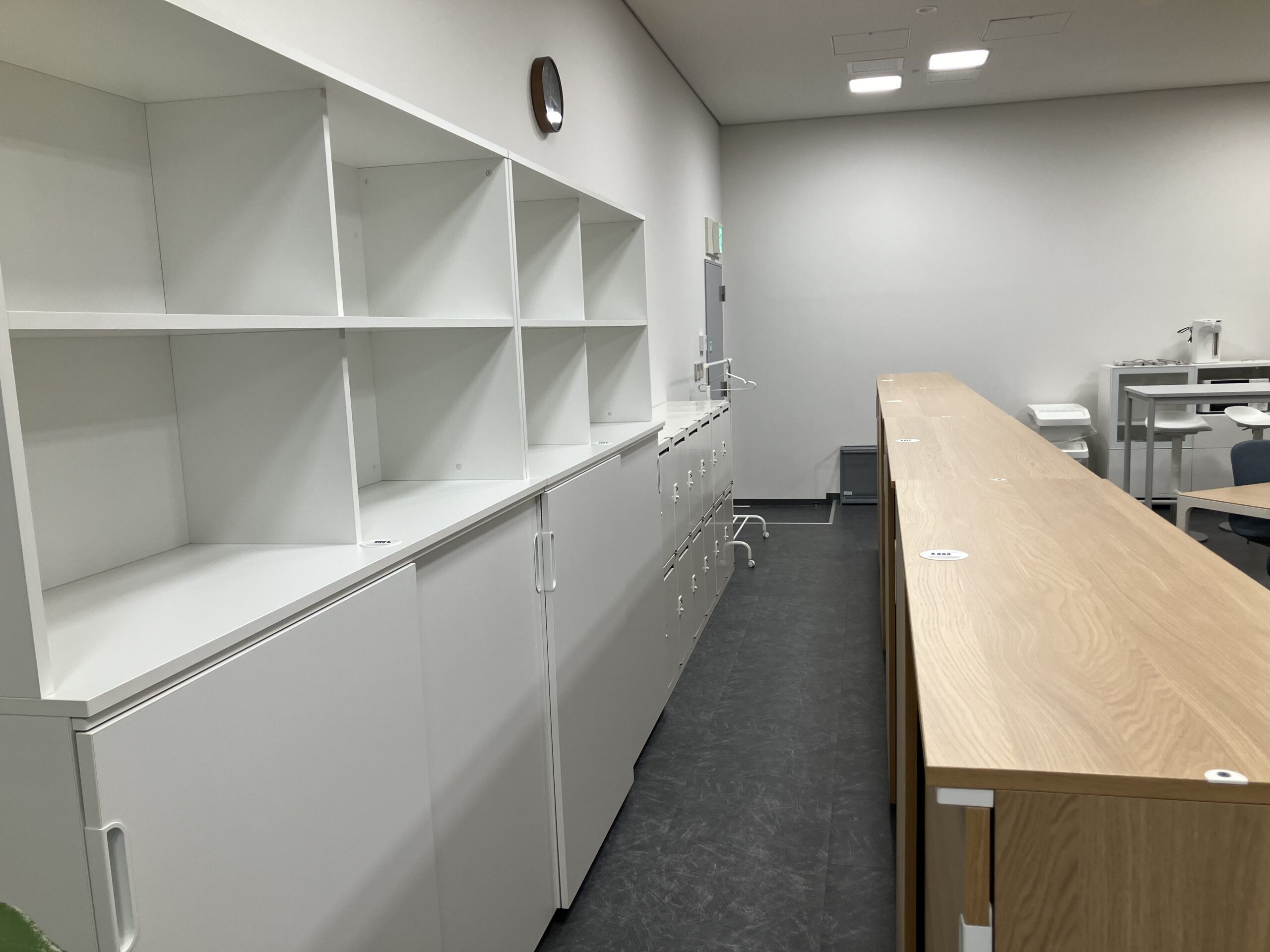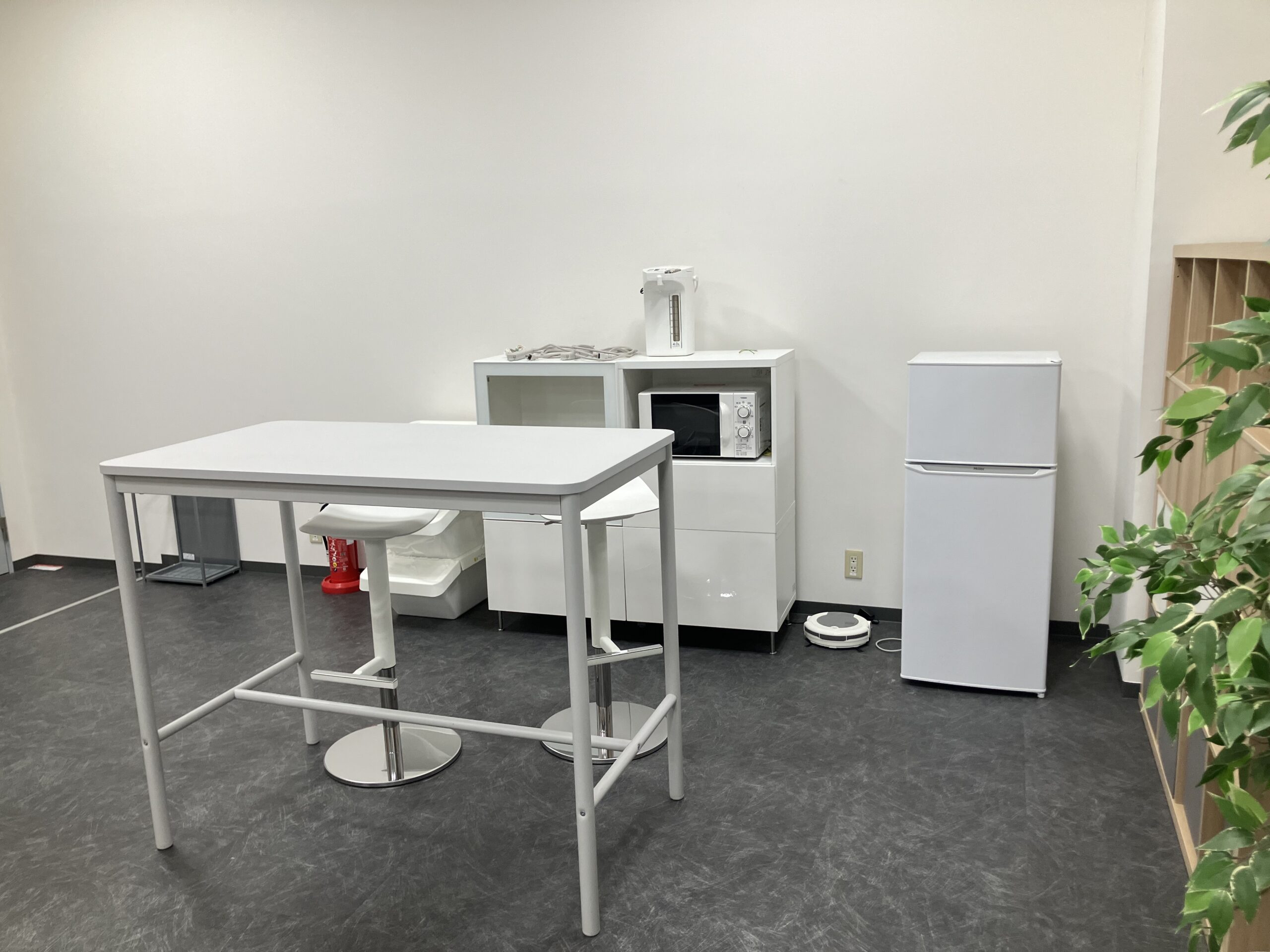 ITM棟3階H-12区画は、デスクやテーブル、ロッカーや収納ラック等のオフィス家具、冷蔵庫、電子レンジ、電気ポット等の家電を備付でご用意したお部屋です。