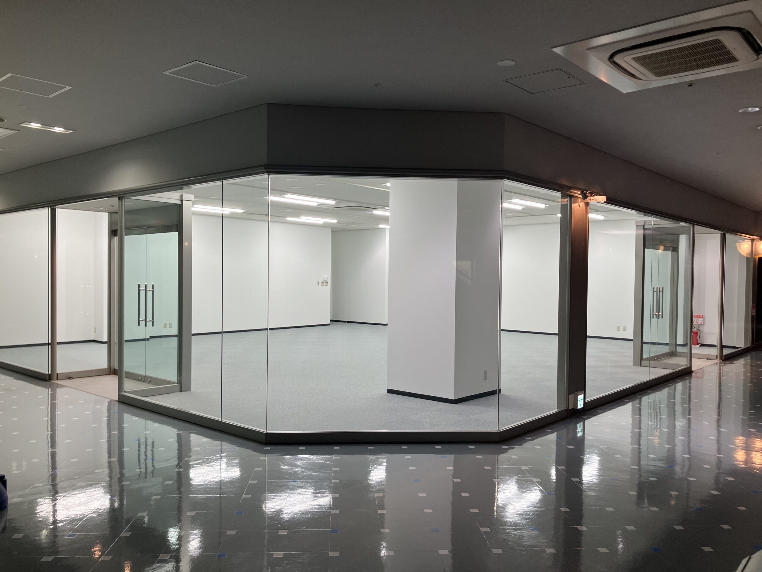 4辺のうち2辺はガラス面かつ、吹抜けに面した場所ですので、来客の多いオフィスやショールームに適しています。