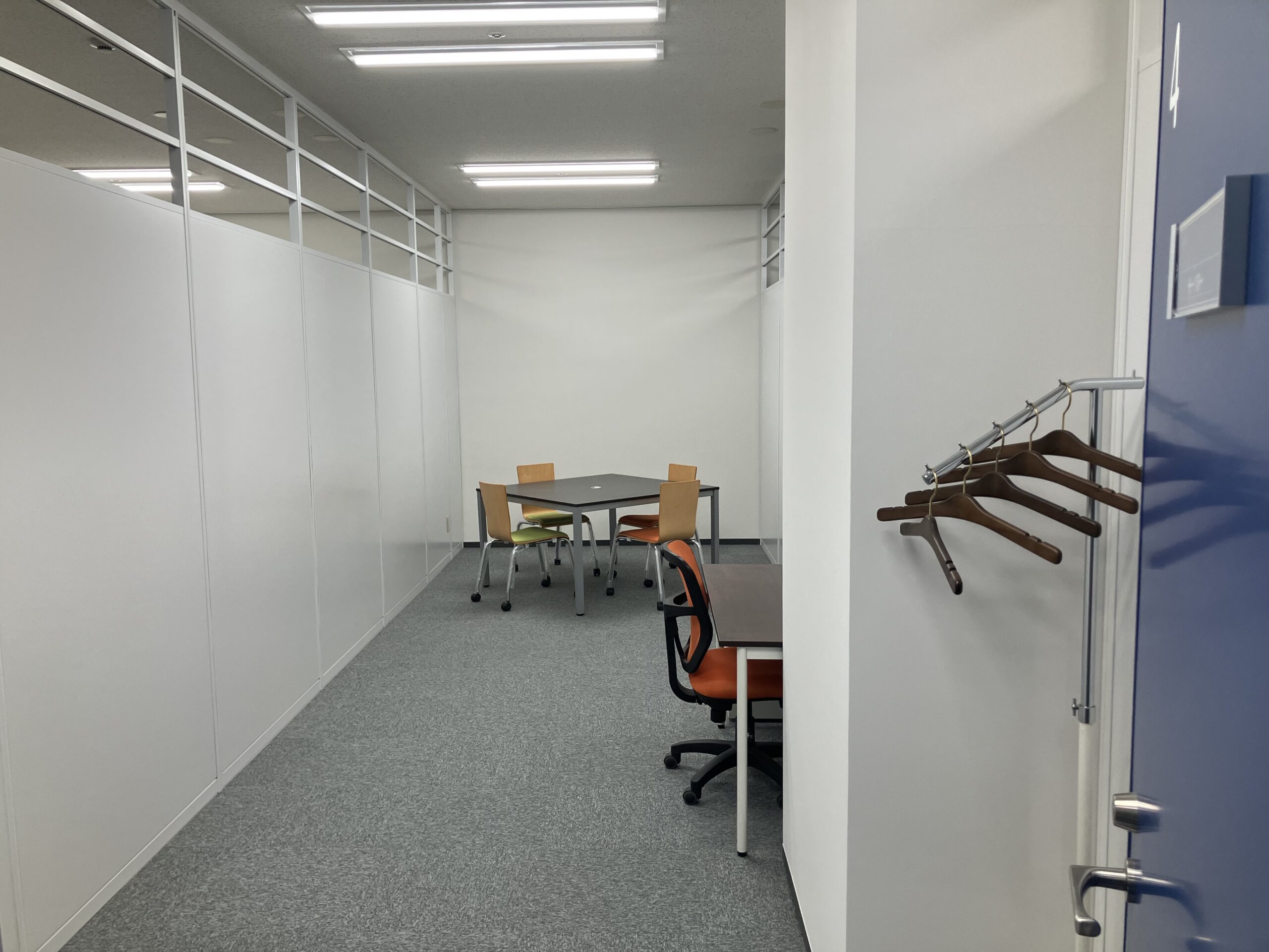 ITM棟5階H-10-4区画は、デスクやテーブル、キャビネットを備付で設置しており、入居いただいたその日から事業をスタートいただけます。